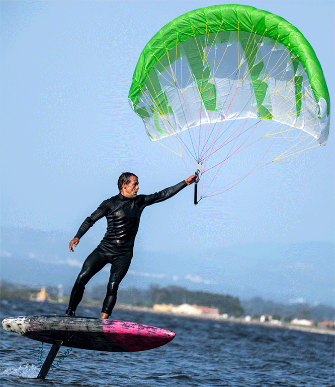 En el agua, la magia ocurre cuando combinas el ala con una tabla de hydrofoil — una tabla especial con un “ala” submarina que te eleva por completo sobre la superficie. ¿El resultado? Ya no te deslizas sobre el agua… vuelas sobre ella. Es suave, silencioso y absolutamente adictivo.