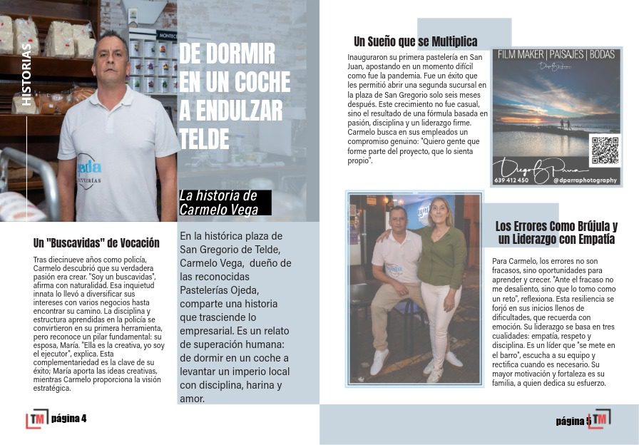 Las Pastelerías Ojeda son solo el comienzo. Carmelo ve su éxito como una plataforma para devolverle a Telde la confianza que depositó en él. Como empresario e inversor, está inmerso en la creación de eventos, festivales y espacios musicales pensados para 2026. “Creo que es un buen momento para emprender en Telde, invertir aquí”, sostiene con energía. Su visión es comunitaria: “Es importante ayudar a crecer a la comunidad. Dar calidad, ser serios y contribuir”.