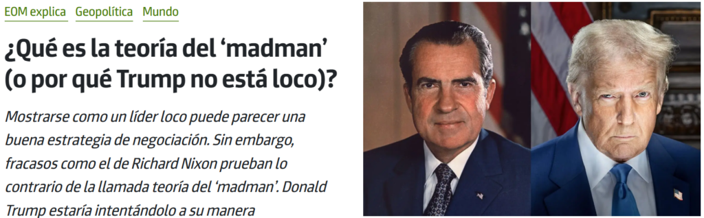 Recomiendo mucho el artículo de Nerea Seijas publicado el 24/03/2025 en El Orden Mundial (dejo enlace aquí). Ella afirma: “Trump no está loco, es predeciblemente impredecible”. Ella clava el origen nixoniano y los riesgos.