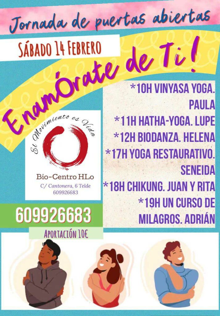 Bio Centro HLo está en Telde, en la C/Cantoneras, 6 y ofrece clases regulares de Biodanza, yoga, taichí, chikung y otras disciplinas de desarrollo personal. Para más información sobre la jornada «Enamórate de ti» del 14 de febrero, puedes contactar directamente con el centro al 609 926 683.
